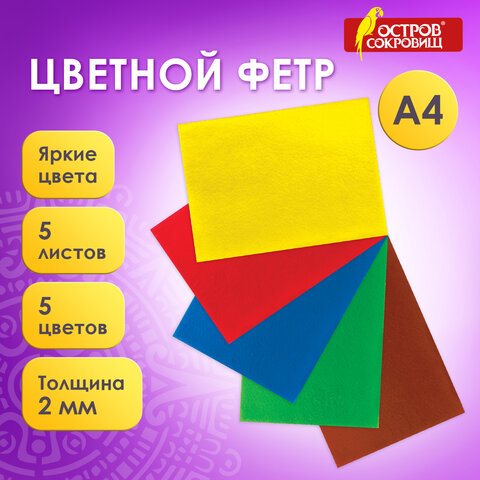 Цветной фетр МЯГКИЙ А4, 2 мм, 5 листов, 5 цветов, плотность 170 г/м2, ОСТРОВ СОКРОВИЩ, 660620