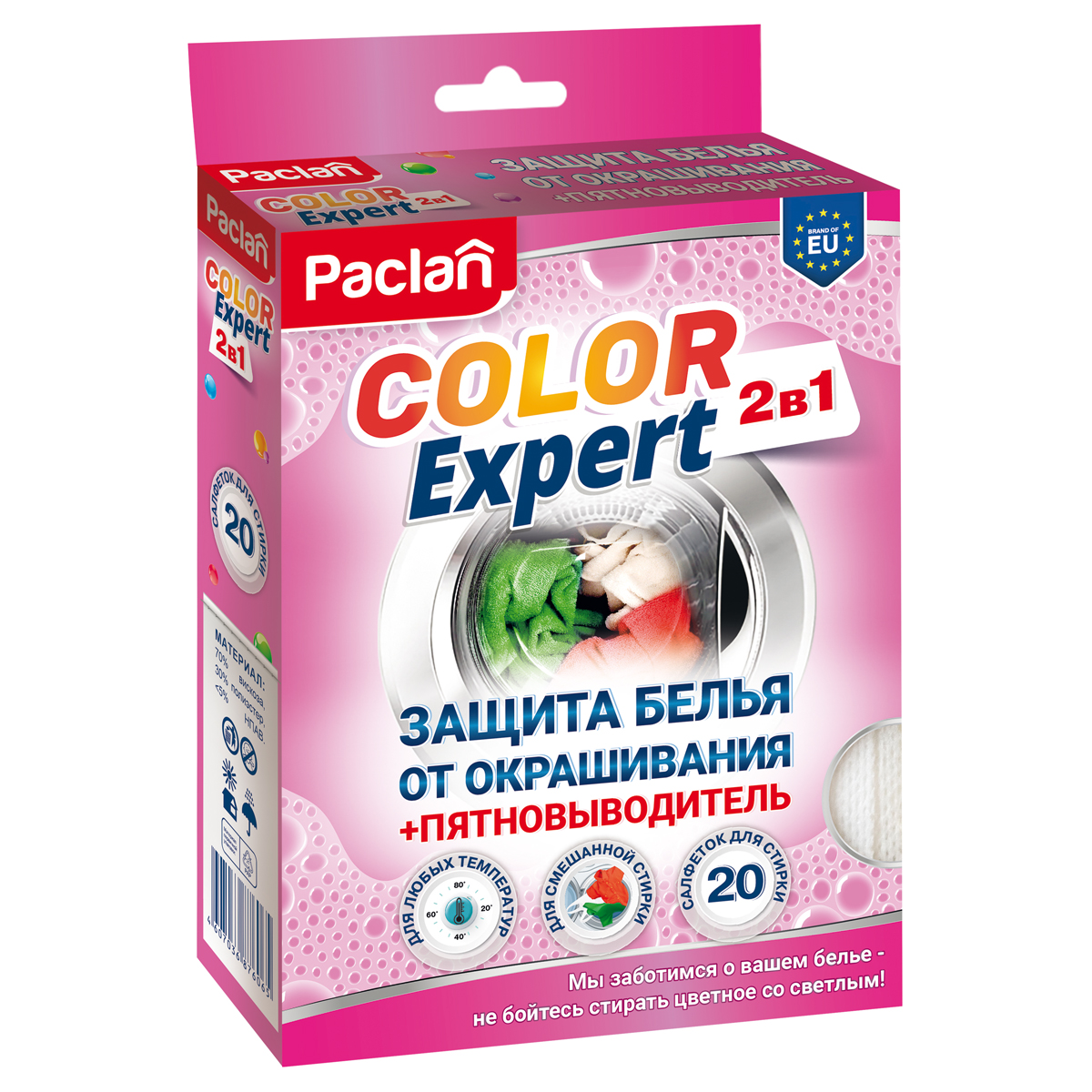 Салфетки для предотвращения окрашивания + пятновыводитель во время смешанной стирки, Paclan "Color expert 2в1", 20шт