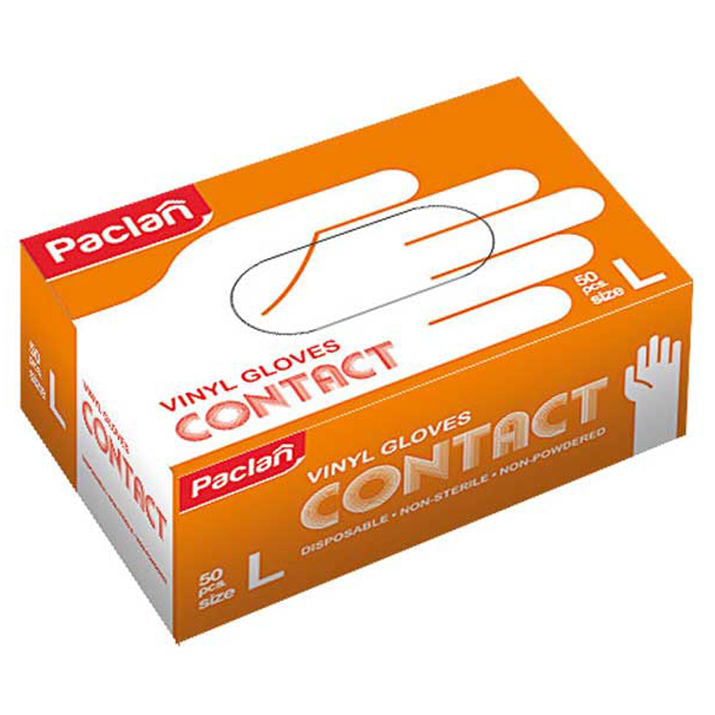 Перчатки виниловые Paclan "Contact" неопудренные L, 50шт., картон. коробка