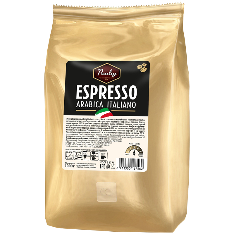 Кофе в зернах Paulig "Espresso Arabica Italiano", вакуумный пакет, 1кг