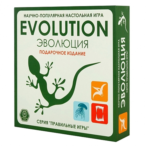 Игра настольная " Правильные игры " Эволюция. Подарочное издание, состав: 84 карты (набор «Эволюция»), 42 карты (набор «Время летать»), 42 карты (набор «Континенты»), 18 специальных карт, большая карта континентов, 6 разделителей территорий, 70 фишек еды,
