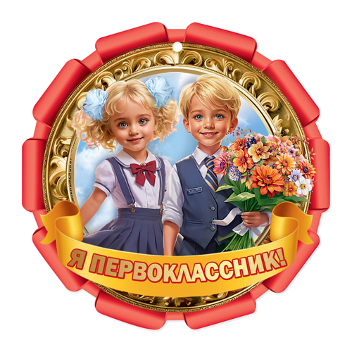 Медаль картонная Я первоклассник! D=96мм " Праздник " 060, Девочка и мальчик с букетом, текст