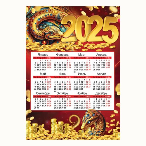 Календарь настенный " Праздник " 406 на 2025г 205*291мм Символ года- Золотая змея, 12 месяцев на одном листе, мелованная бумага, без отделки
