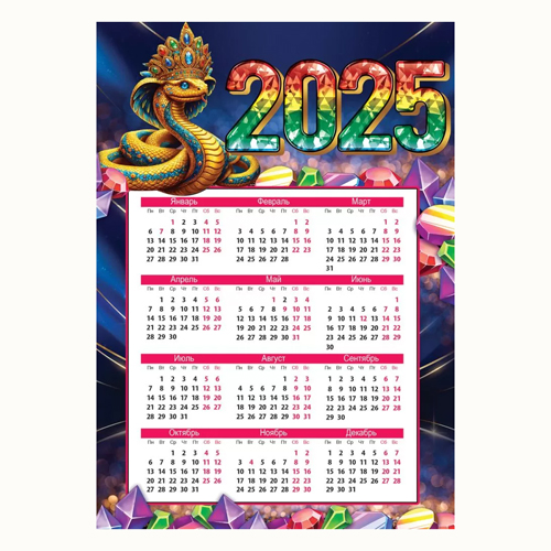 Календарь настенный " Праздник " 602 на 2025г 297*420мм Символ года-Змея в короне, 12 месяцев на одном листе, мелованная бумага, без отделки