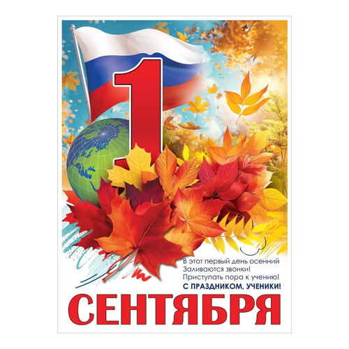 Плакат " Праздник " 941 А2 1 сентября Российский флаг, глобус, листья, без отделки, текст