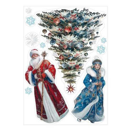 Наклейки " Праздник " 509 Новогодние- Дед Мороз, Снегурочка и ёлка, 332*470мм, двусторонние, глянцевый УФ-лак, белила