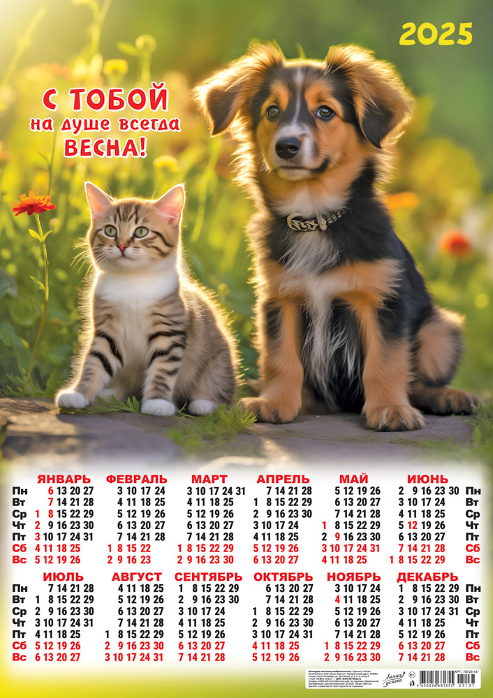 Календарь ЛИСТОВОЙ А2 (2025) Кот и пес. С тобой на душе всегда весна