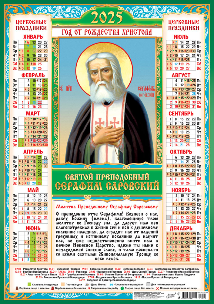 Календарь ЛИСТОВОЙ А2 (2025) Иконы.Серафим Саровский (на зеленом)