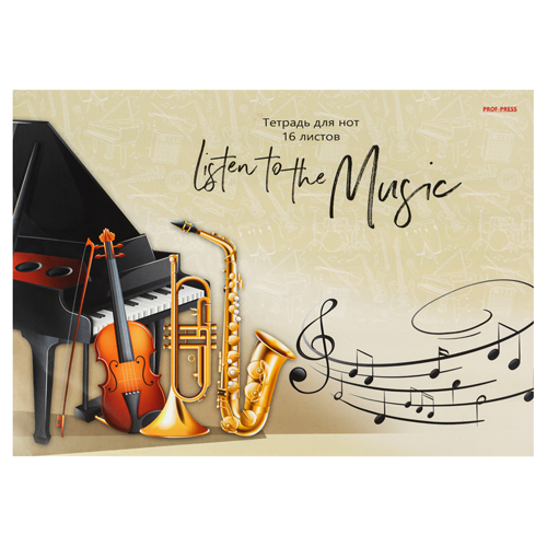 Тетрадь для нот " Проф-Пресс " А4 16л Слушай музыку!, на скобе, цветная мелованная обложка