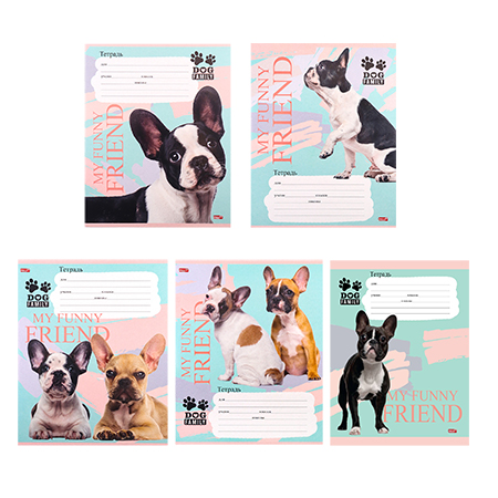 Тетрадь А5 12л " Проф-Пресс " клетка Эконом Французские бульдоги (ассорти), офсет, на скобе, обложка - мелованная бумага, 5 дизайнов в спайке