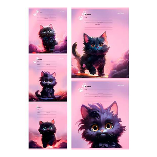 Тетрадь А5 12л " Проф-Пресс " клетка Черный котик, офсет, на скобе, обложка- мелованная бумага, 5 дизайнов в спайке