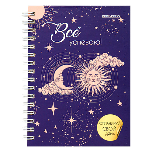 Ежедневник недатированный МАЛЫЙ ФОРМАТ А6 105*144мм 7БЦ спираль " Проф-Пресс " 48л Все успеваю. Солне и луна, в точку, матовый ламинированный картон, дизайнерский цветной блок, выборочный лак