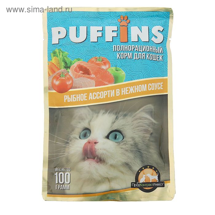 Влажный корм "Puffins" для кошек, сочные кусочки рыбное ассорти в соусе, 100 г