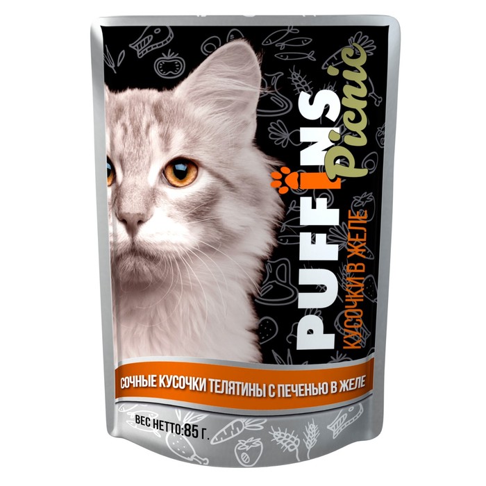 Влажный корм "Puffins picnic" для кошек, телятина с печенью в желе 85 г