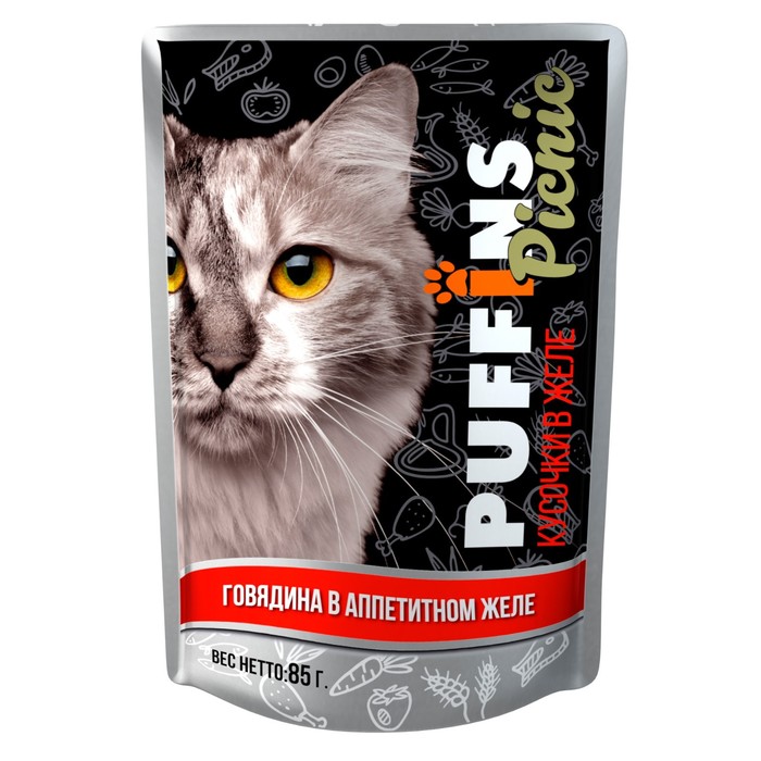 Влажный корм "Puffins picnic" для кошек, говядина в желе, 85 г