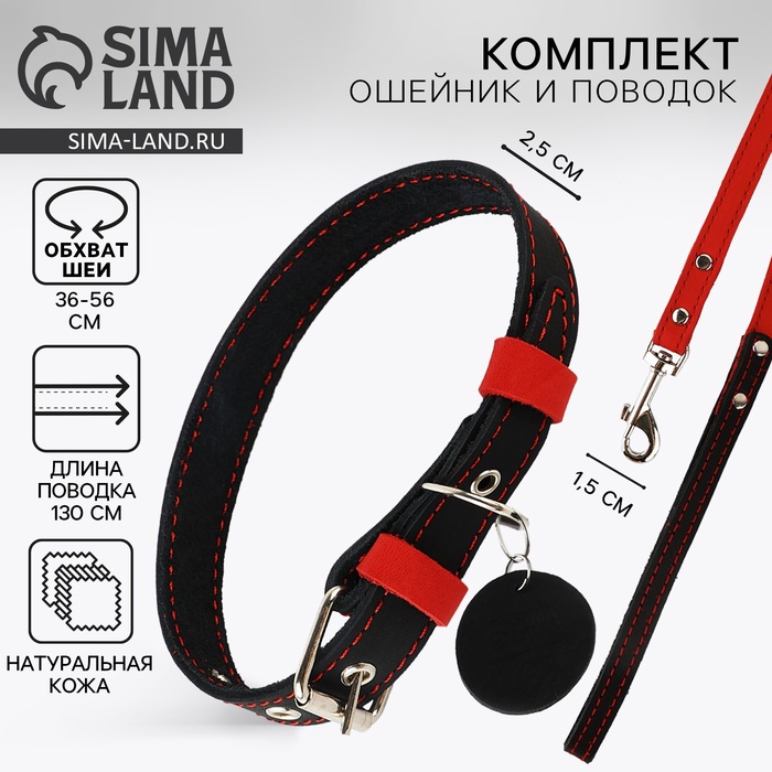 Комплект : ошейник (36-56х2.5 см) и поводок (130х1.5 см), цвет чёрный и малиновый