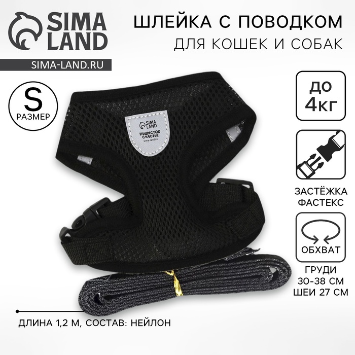 Шлейка дышащая с поводком и светоотражающей нашивкой, S, ОШ 27, ОГ 30-38, черная