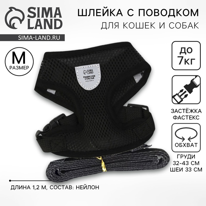 Шлейка дышащая с поводком и светоотражающей нашивкой, M, ОШ 33, ОГ 32-43, черная