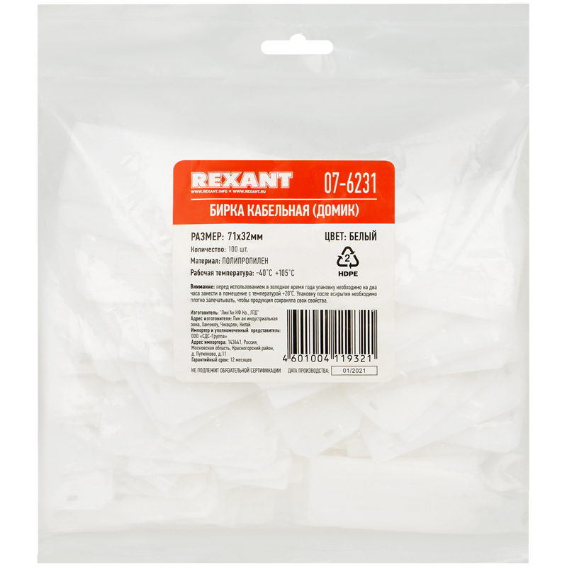 Бирка кабельная Rexant "Домик прямоугольный" белая (100шт./уп.)