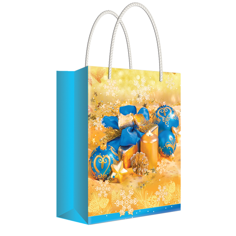 Пакет подарочный новогодний 11*13,5*6см Русский дизайн "Елочные украшения в синем цвете", ламинир.