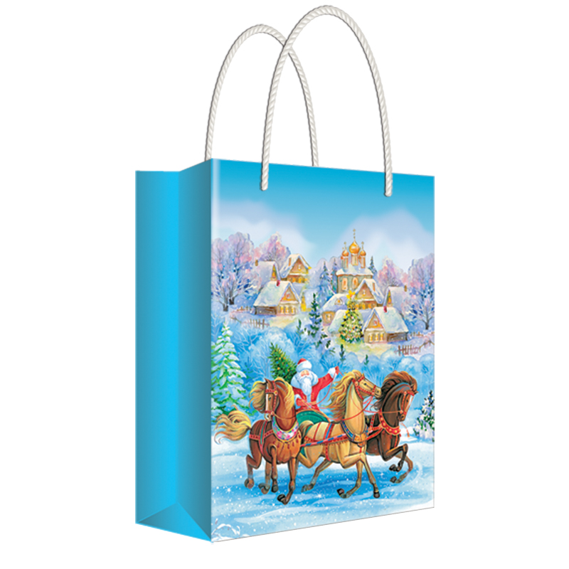 Пакет подарочный новогодний 26*32,7*13,6см Русский дизайн "Дед Мороз на санях с лошадьми", ламинир.