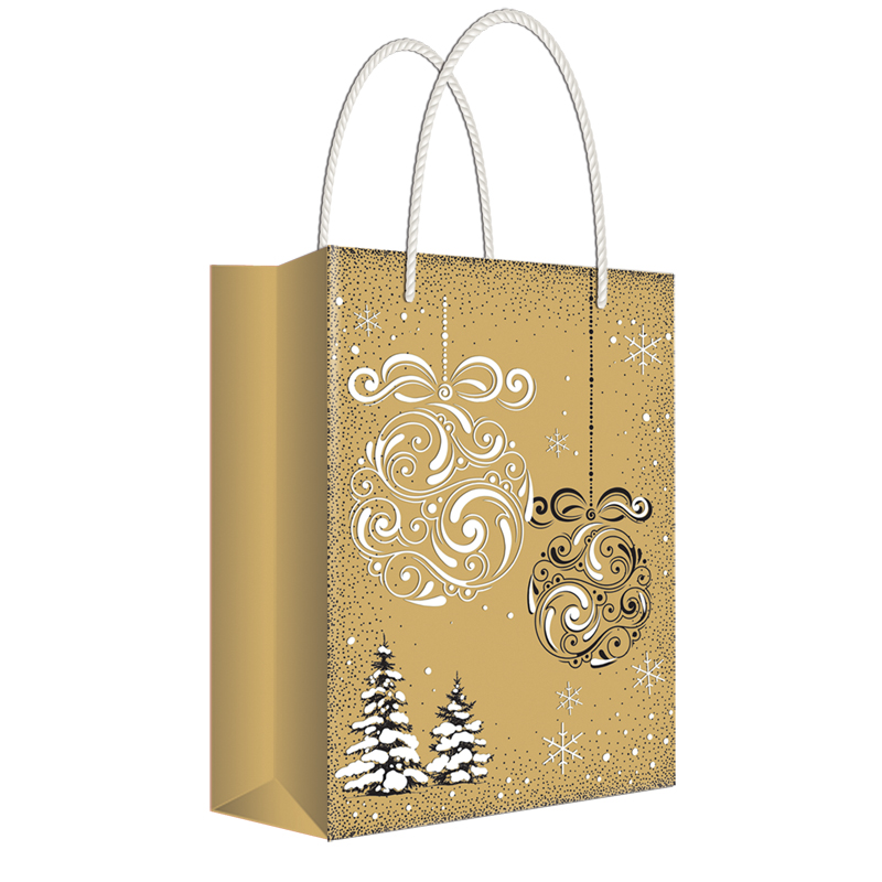 Пакет подарочный новогодний 11*13,5*6см Русский дизайн "Новогодние игрушки в золоте ", ламинир.