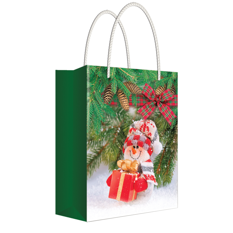 Пакет подарочный новогодний 11*13,5*6см Русский дизайн "Снеговик с подарком", ламинированный