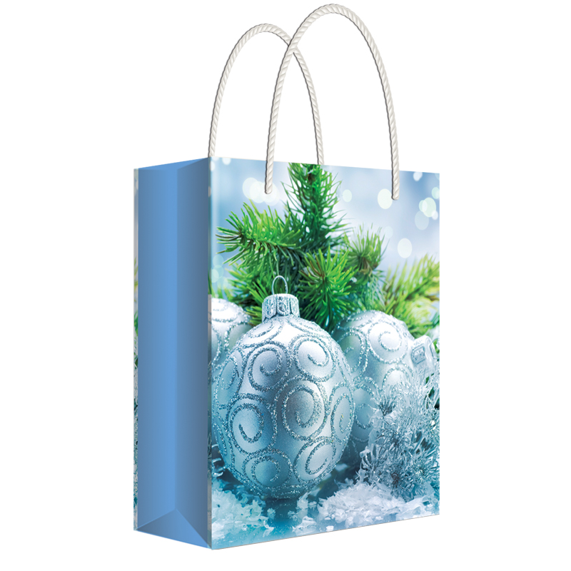 Пакет подарочный новогодний 11*13,5*6см Русский дизайн "Елочные украшения в синем цвете", ламинир.