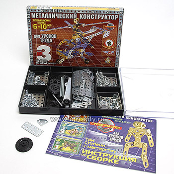 Конструктор " Русский стиль " №3 для уроков труда, 293 детали, металлический, отвертка, гаечный ключ, детали конструктора, с помощью инструкции с иллюстрациями ребенок сможет собрать 24 предложенных варианта моделий