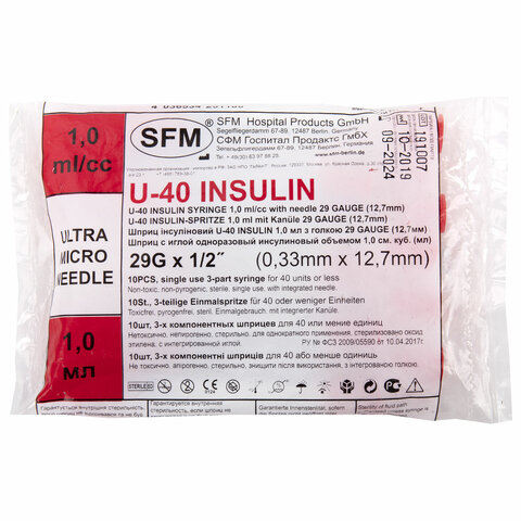 Шприц инсулиновый SFM, 1 мл, КОМПЛЕКТ 10 шт., в пакете, U-40 игла несъемная 0,33х12,7 мм - 29G, 534251