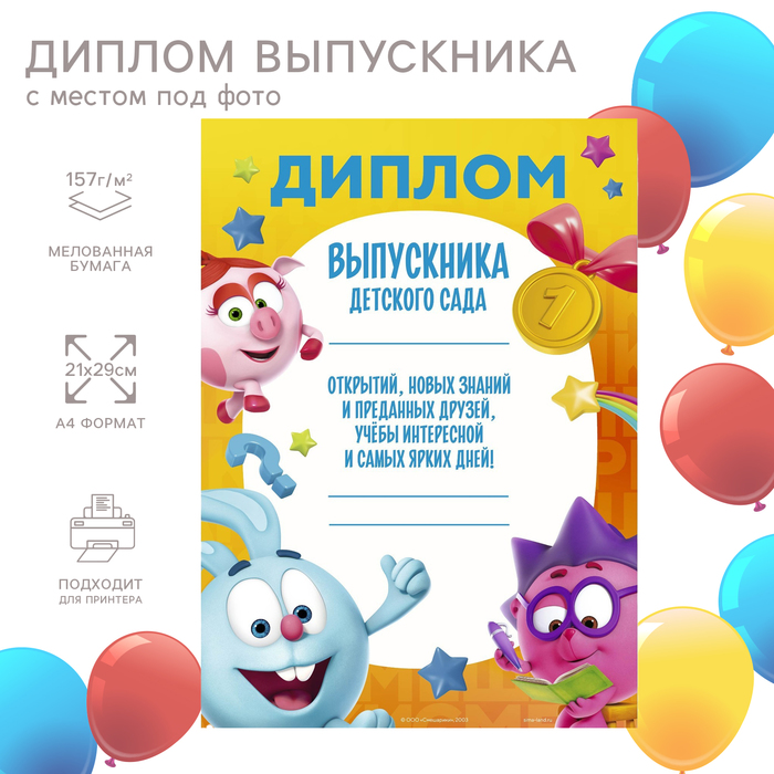 Диплом на выпускной "Выпускник детского сада" А4, Смешарики