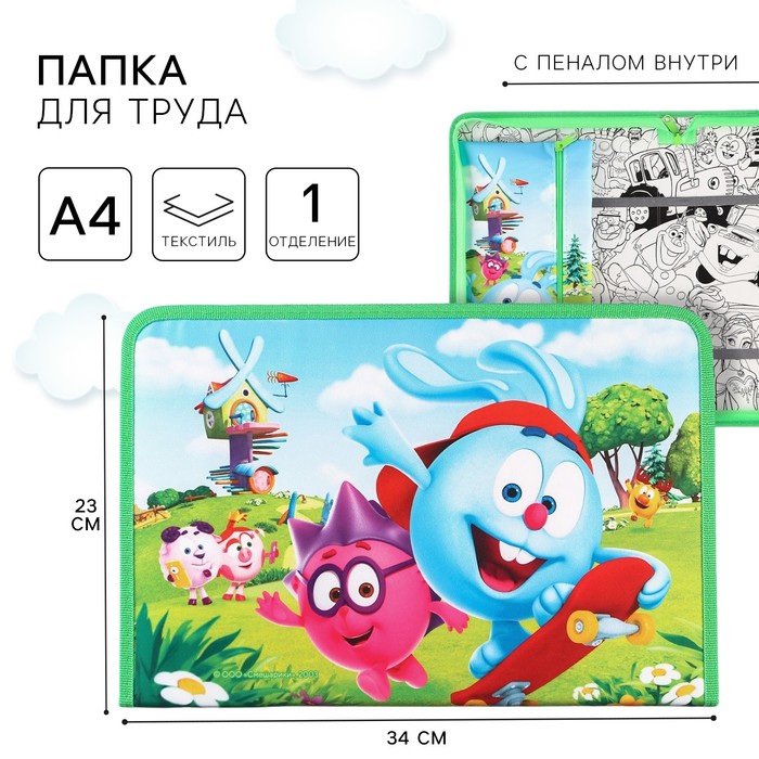 Папка для труда А4 с пеналом, на молнии, текстиль, Смешарики