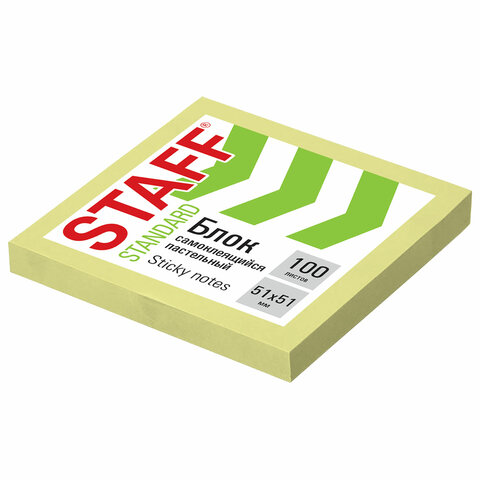 Блок самоклеящийся (стикеры) STAFF STANDARD, ПАСТЕЛЬНЫЙ 51х51 мм, желтый, 100 листов, 116577