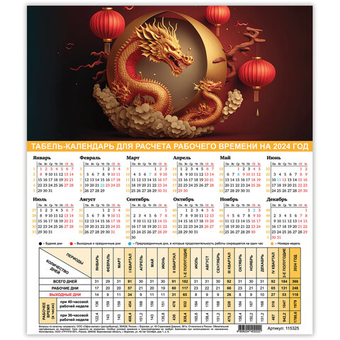 Календарь-табель на 2024 год с рабочими и выходными днями, 195х225 мм, STAFF, "Символ года", 115325