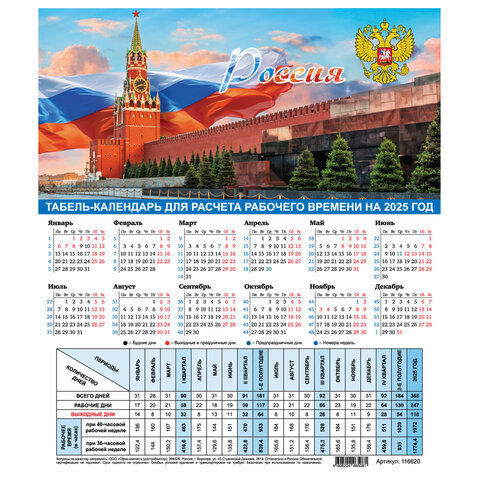 Календарь-табель на 2025 год с рабочими и выходными днями, А4, 195х225мм, Символика России, 116620