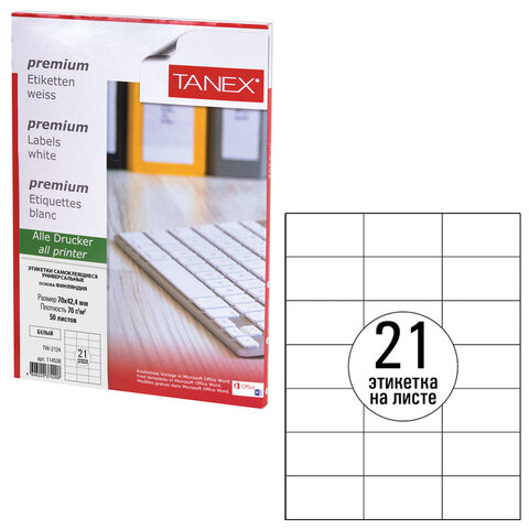 Этикетка самоклеящаяся 70х42,4 мм, 21 этикетка, белая, 70г/м2, 50 листов, TANEX, сырье Финляндия, 114536, TW-2124