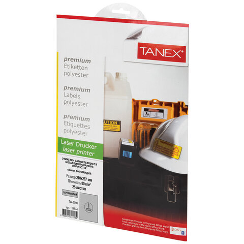 Этикетка самоклеящаяся 210х297 мм, 1 этикетка, полиэстер, серебро, 25 листов, TANEX, сырье Финляндия, 114544, TW-2000
