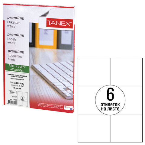 Этикетка самоклеящаяся 105х99 мм, 6 этикеток, белая, 70 г/м2, 50 листов, TANEX, сырье Финляндия, 114530, TW-2303