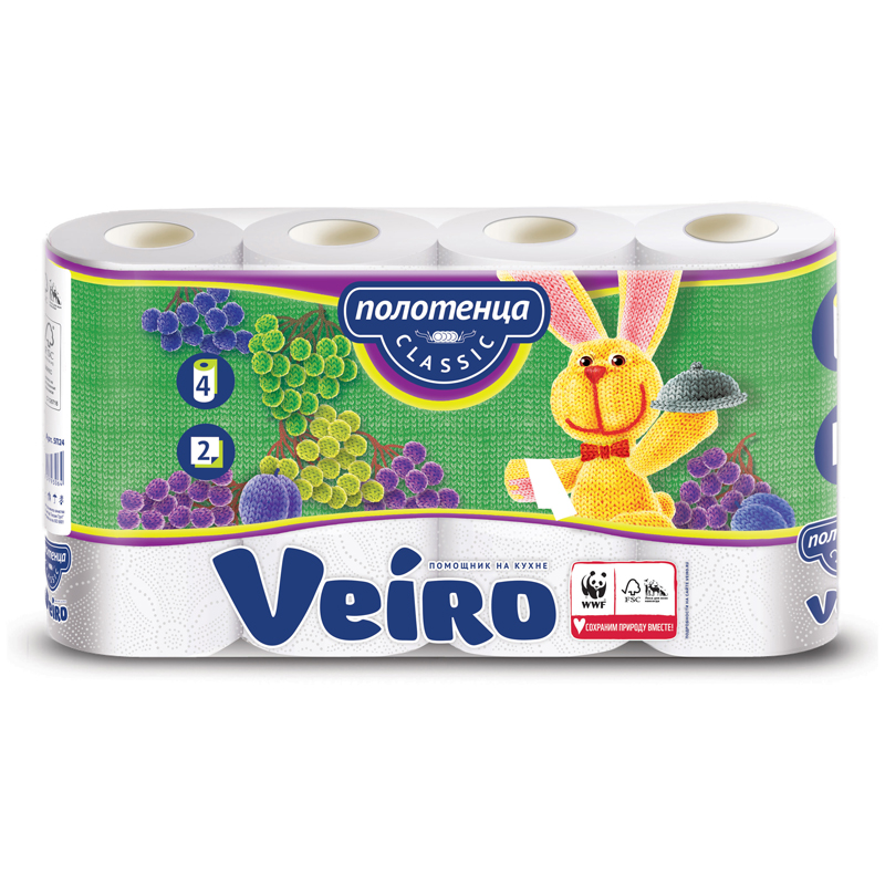 Полотенца бумажные в рулонах Veiro "Classic", 2-слойные, 12,5м/рул., тиснение, белые, 4шт.