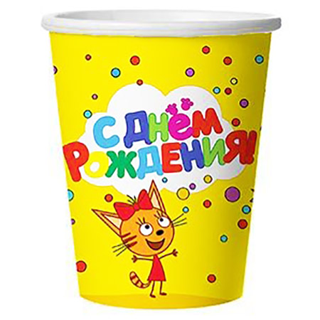 Стаканы бумажные " Веселая Затея " С Днем рождения Три Кота желтый 250мл, в наборе 6шт