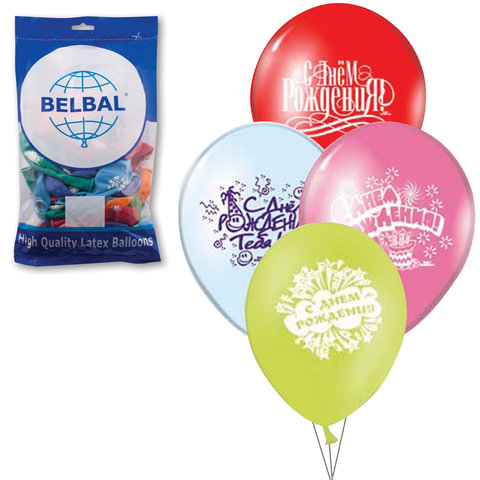 Шары воздушные 12" (30 см), комплект 50 шт., 12 цветов, 8 рисунков "С ДНЕМ РОЖДЕНИЯ", в пакете, 1103-0081