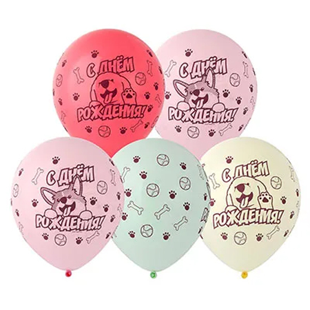 Шар латексный шелкография 12"/30см С Днем рождения! Собачки, ассорти из 4 цветов, 2 дизайнов