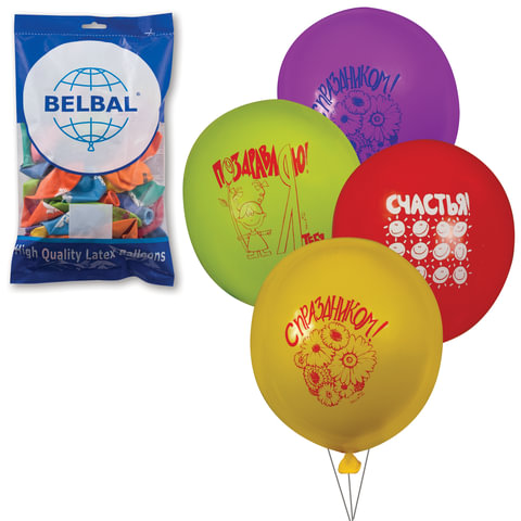 Шары воздушные 12" (30 см), комплект 50 шт., 12 цветов, 8 рисунков "ПОЗДРАВЛЕНИЯ", в пакете, 1103-0077