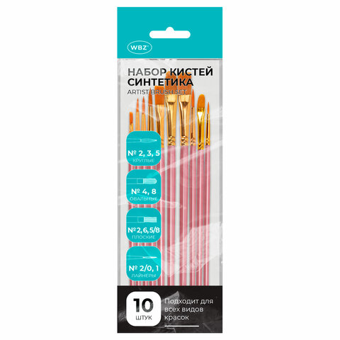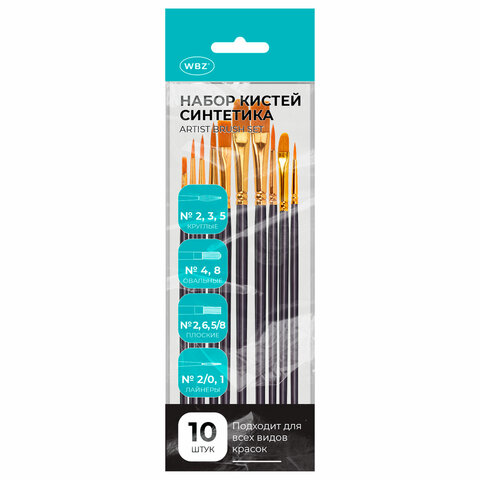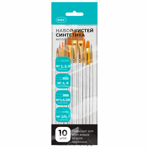 Кисти набор 10 шт., синтетика, белые, № 2/0-8, (Круглые; Овальные; Плоские; Лайнеры),WBZ, 201087