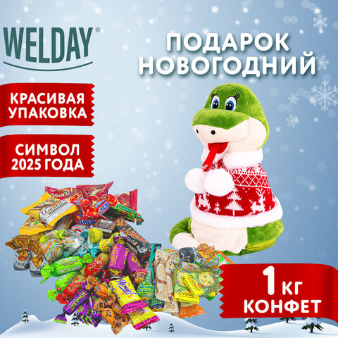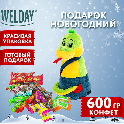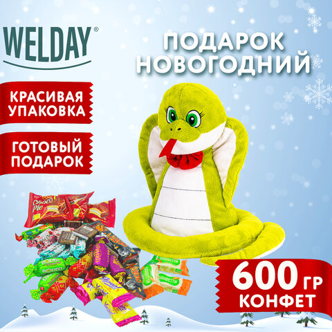 Подарок новогодний ЗЕЛЕНОГЛАЗКА "Мягкая игрушка-символ 2025 года", НАБОР конфет 600г, WELDAY