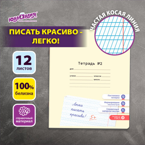 Тетрадь УЧУСЬ ПИСАТЬ № 2 12 л. частая косая линия, со справочным материалом, ЮНЛАНДИЯ, 404852