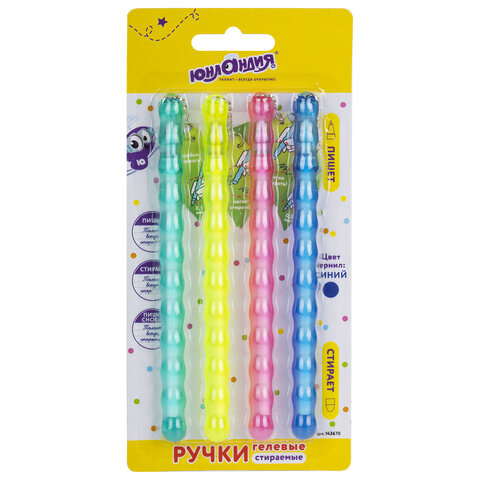 Ручки стираемые гелевые ЮНЛАНДИЯ "Лимонад", НАБОР 4 штуки, СИНИЕ, узел 0,5 мм, линия письма 0,35 мм, 143655
