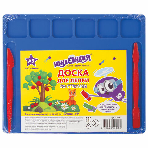 Доска для лепки А5, 200х170 мм, ЮНЛАНДИЯ, ассорти, 6 отделений для пластилина, 2 стека, 227398