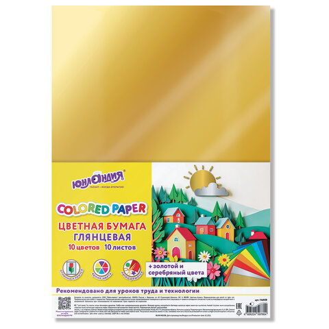 Цветная бумага А4 мелованная ВОЛШЕБНАЯ, 10л. 10цв., 200х280мм, ЮНЛАНДИЯ "ДОМИКИ", Код, 116959