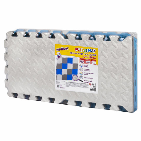 Коврик-пазл напольный 1,2х1,2 м, 16 шт., 30х30 см, толщина 1 см, серый, голубой, св.серый, ЮНЛАНДИЯ, 664813